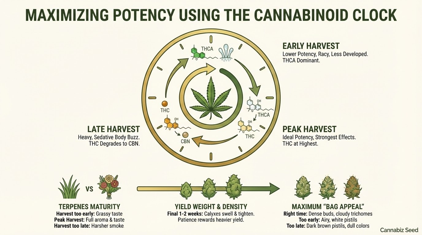 - Vrchol sklizně: Toto je ideální okamžik, kdy se THCA zcela přeměnil a hladina THC je nejvyšší. Sklizeň v tomto okamžiku vám zajistí nejsilnější a nejpřesnější účinky dané odrůdy.