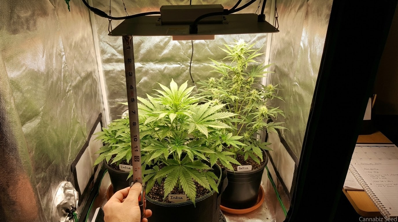 Indicas wachsen weniger in die Höhe (oft nur 25–50 % ihrer Vegetationshöhe). Das bedeutet, dass Sie sie länger vegetieren lassen und später umdrehen können. Sativas wachsen deutlich mehr in die Höhe (bis zu 250 % ihrer Vegetationshöhe) und müssen daher viel früher umgedreht werden, um den Platz im Zelt zu sparen.