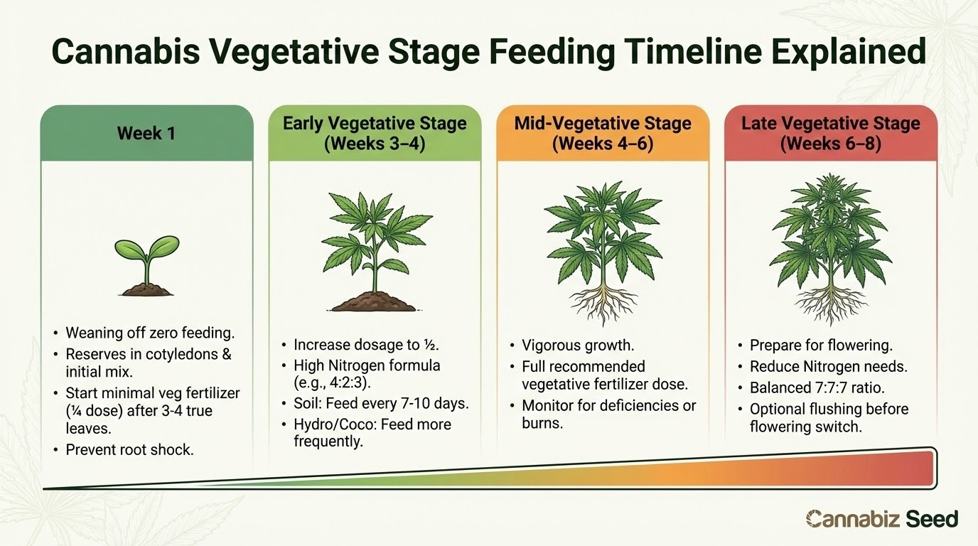 Esimese vegetatiivse kasvu nädala jooksul lõpetavad teie taimed nulltoitmise, kuna nad lõpetavad seemikute kasvatamise etapi. Sel ajal toituvad nad seemnekotiljonides talletatud toiduvarudest ja algses potimullas olevatest mineraalidest.