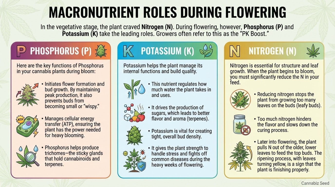 Pereiti iš vegetatyvinio etapo į žydėjimo etapą reikalauja staigaus mitybos įpročių pokyčio. Sutelkite dėmesį į tris pagrindines taisykles: sumažinkite azoto kiekį, žymiai padidinkite fosforo ir kalio kiekį ir nuolat stebėkite pH lygį.
