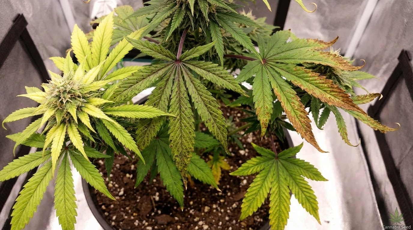 - „Kibirkštis“ (azoto toksiškumas): jei lapų galiukai nusisuka žemyn kaip kibirkštis, augalas turi per daug azoto. Tai paprastai atsitinka ankstyvuoju žydėjimo laikotarpiu ir geriausia išspręsti šią problemą laiku pakeičiant maistinių medžiagų santykį.