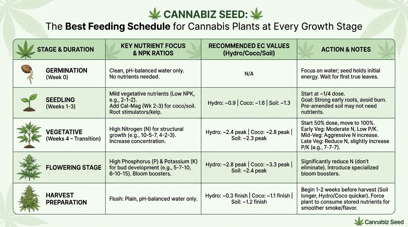 Šiame tipiniame augimo etapų maitinimo grafike pateiksime tiesiogines EC vertes, todėl, jei naudojate ppm, konvertuokite jas pagal savo matuoklio skalę. Įprasta EC į PPM konvertavimo formulė yra EC × 700 kalio chlorido skalei ir EC × 500 natrio chlorido skalei.