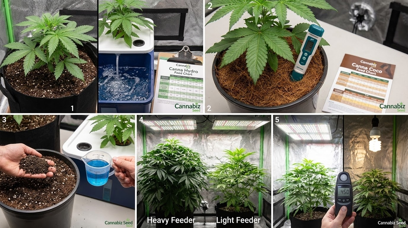Daug maistinių medžiagų reikalaujantys augalai, kaip ir dauguma fotoperiodinių augalų, paprastai reikalauja stipresnių mišinių augimo ir žydėjimo pikų metu. Esant galingoms LED lempoms arba papildomam CO₂, jie dažnai pranoksta bazinį grafiką ir gali pasinaudoti šiek tiek didesniu EC, jei augimas išlieka sveikas.