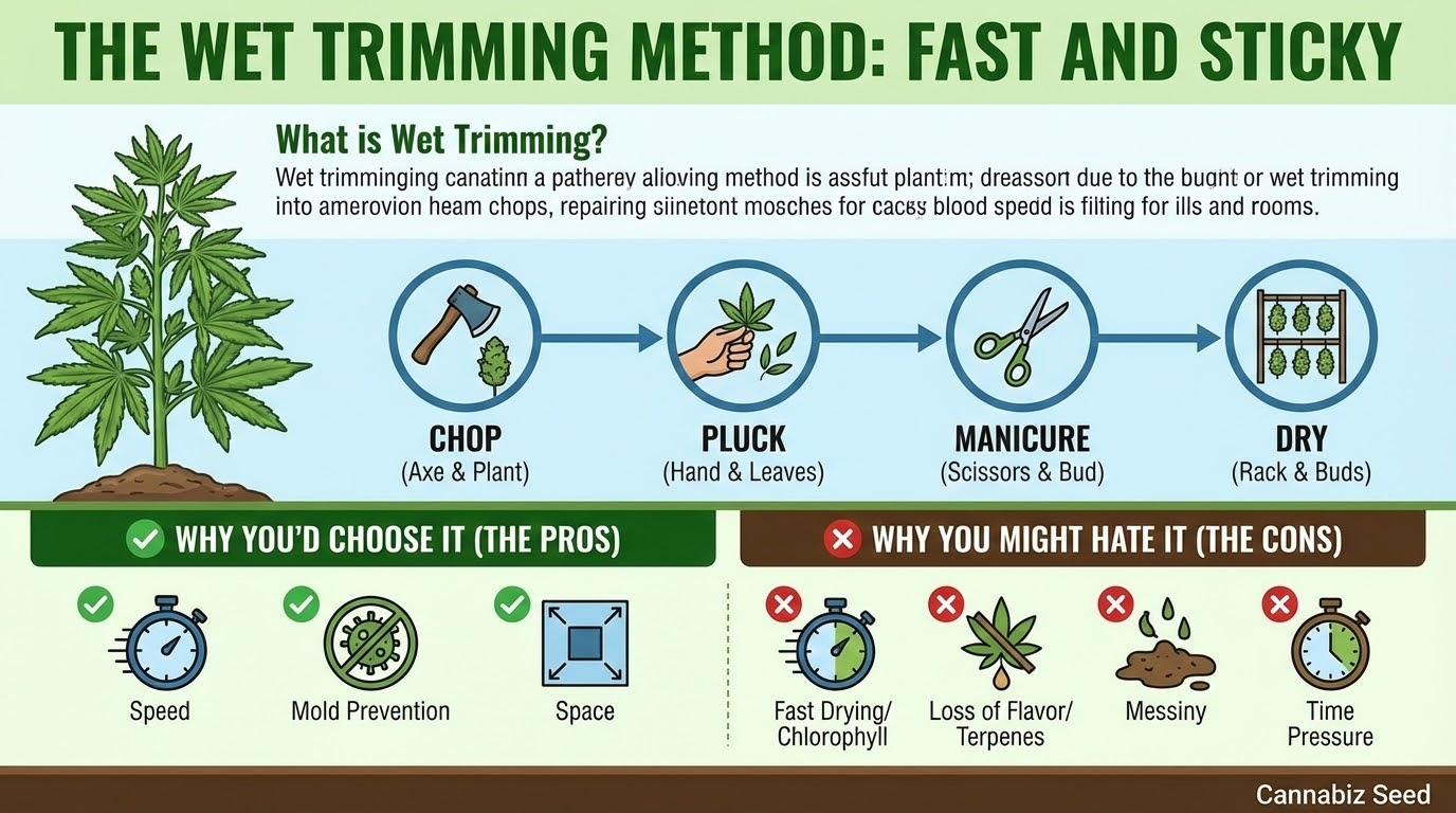 Šlapias apkarpymas reiškia, kad jūs manikiūruojate pumpurus iškart po to, kai nupjaunate augalą, ir prieš pradėdami džiovinimo procesą. Viskas dar yra žalia , lipni ir pilna drėgmės.