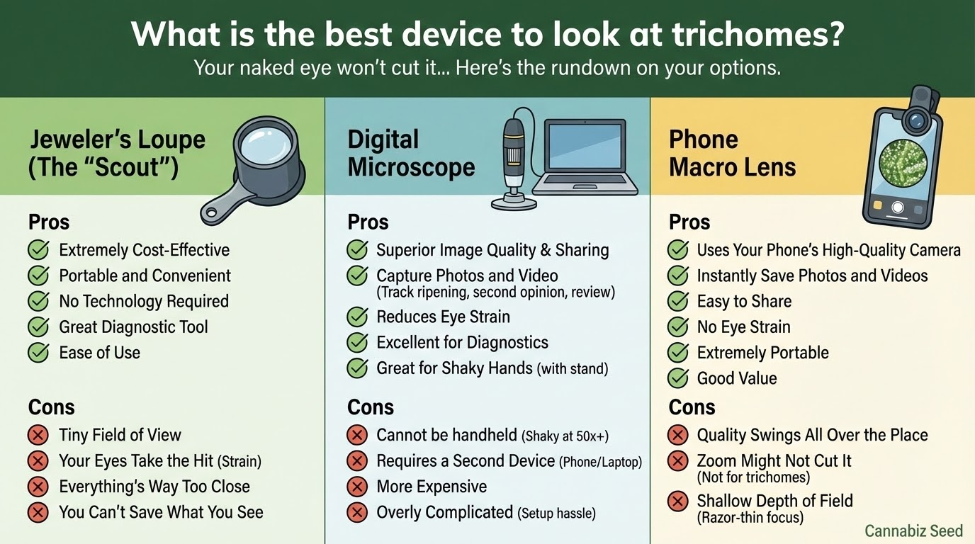 Dit is het favoriete wapen van gevorderde kwekers. Een digitale microscoop voor trichomen kan rechtstreeks op je telefoon of laptop worden aangesloten, wat een wereld van verschil maakt.