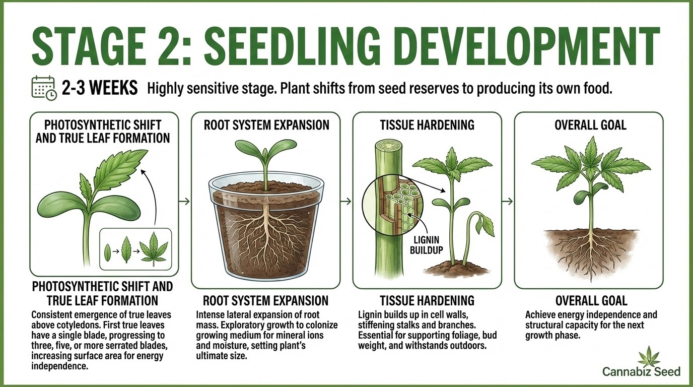 - Dwa rozwinięte, gładkie liście rozpoczynają fotosyntezę na niskim poziomie, która trwa do momentu pojawienia się prawdziwych liści. Ta stabilność strukturalna oficjalnie oznacza koniec fazy kiełkowania.
