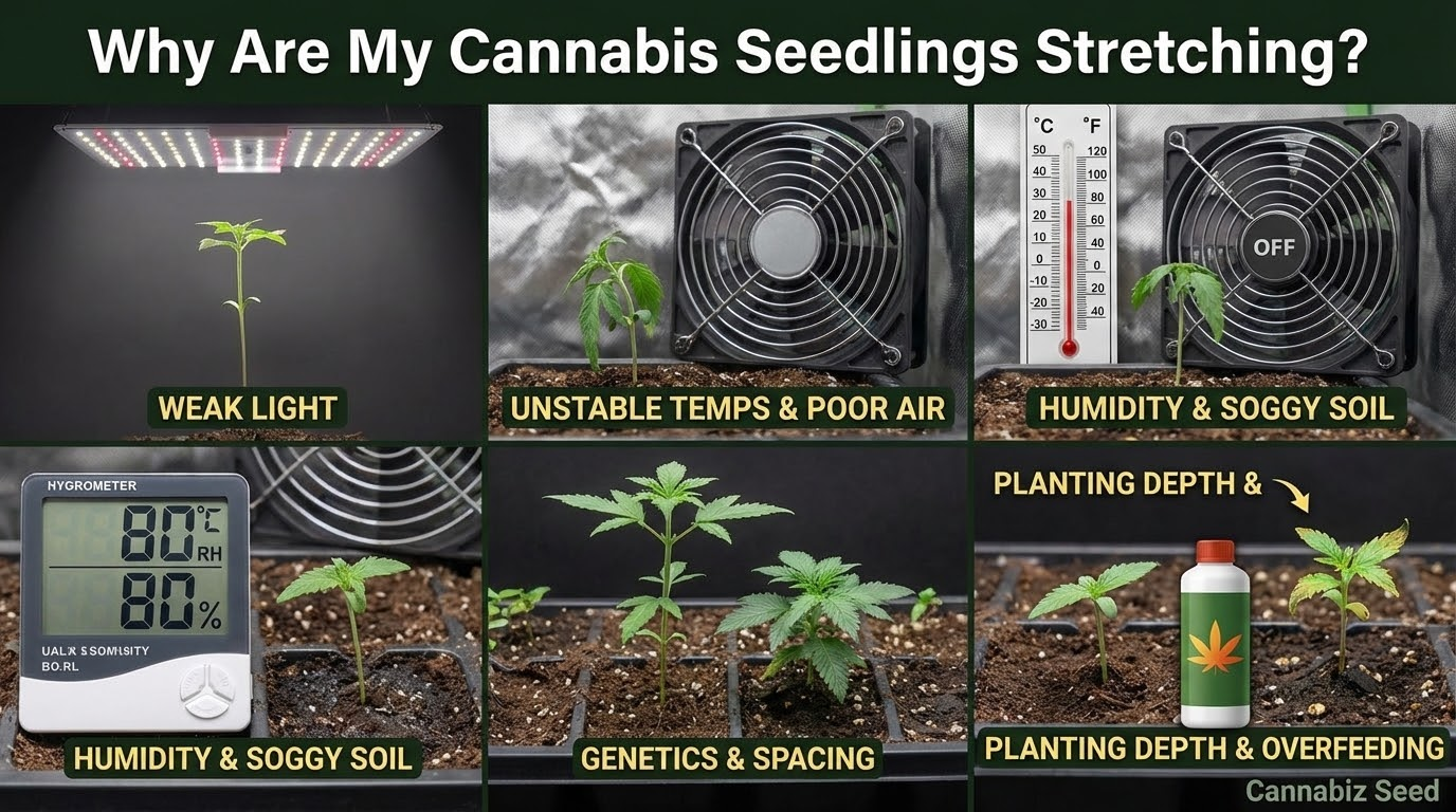 Jednak nie wszystko jest jeszcze stracone. Naprawienie tych długonogich sadzonek konopi jest wykonalne, a nawet łatwe, gdy zrozumiesz, dlaczego tak się dzieje. Ten przewodnik przedstawia przyczyny, sposoby zaradzenia i sztuczki, które pozwolą na zawsze powstrzymać wydłużanie się sadzonek.